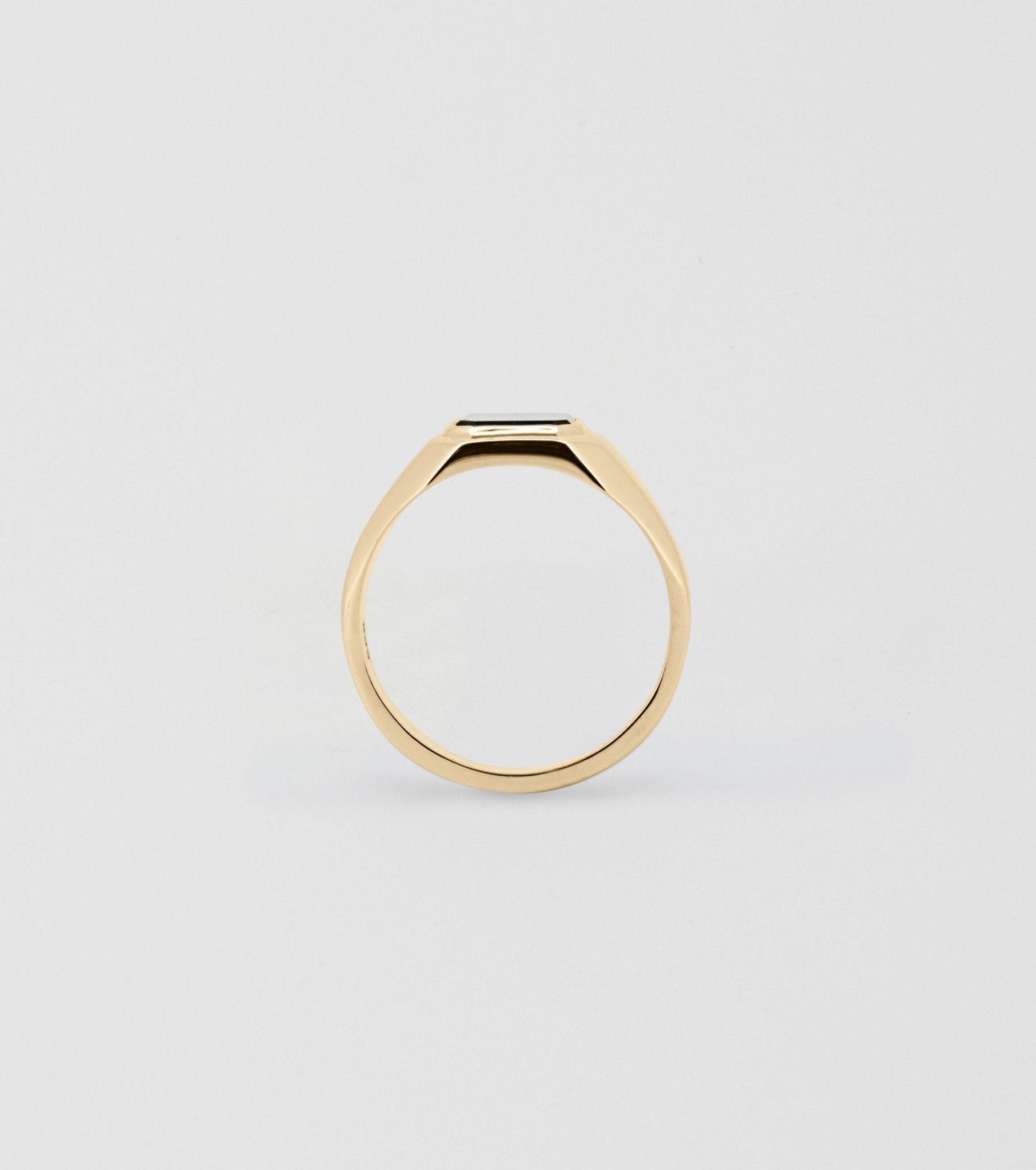 An octagonal cut bloodstone, featuring the subtlest flecks of red through a deep green hue, is set into the face our Ornament signet ring handcrafted in 9ct solid yellow gold.