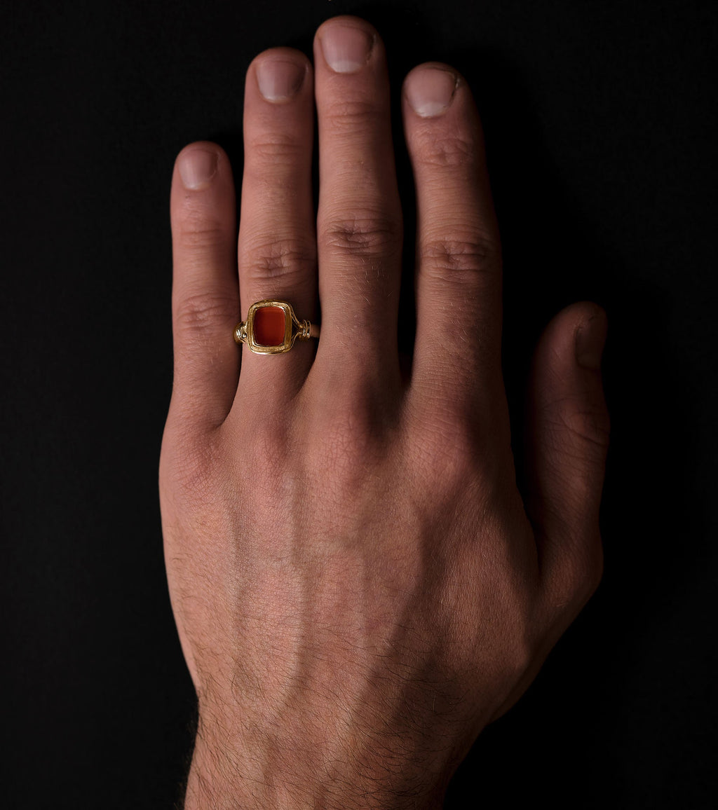The split shank of the Heirloom Carnelian Signet Ring is traditionally Georgian in its style. It is a statement of the reflective qualities of human beings. There is an inherent softness and a resemblance of arms holding the stone, coupled with power.
