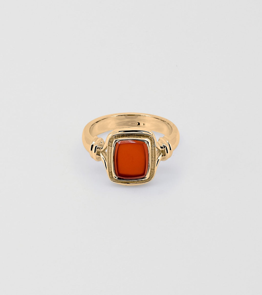 Our Heirloom Signet Ring is handcrafted in 9ct yellow gold, and set with a red Carnelian, for perfect contrast.
