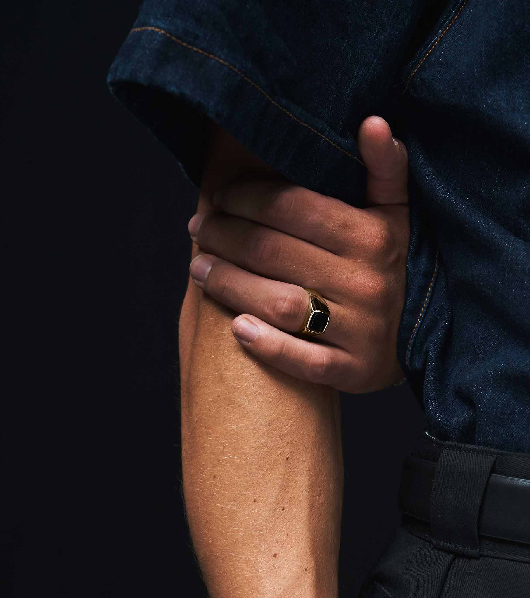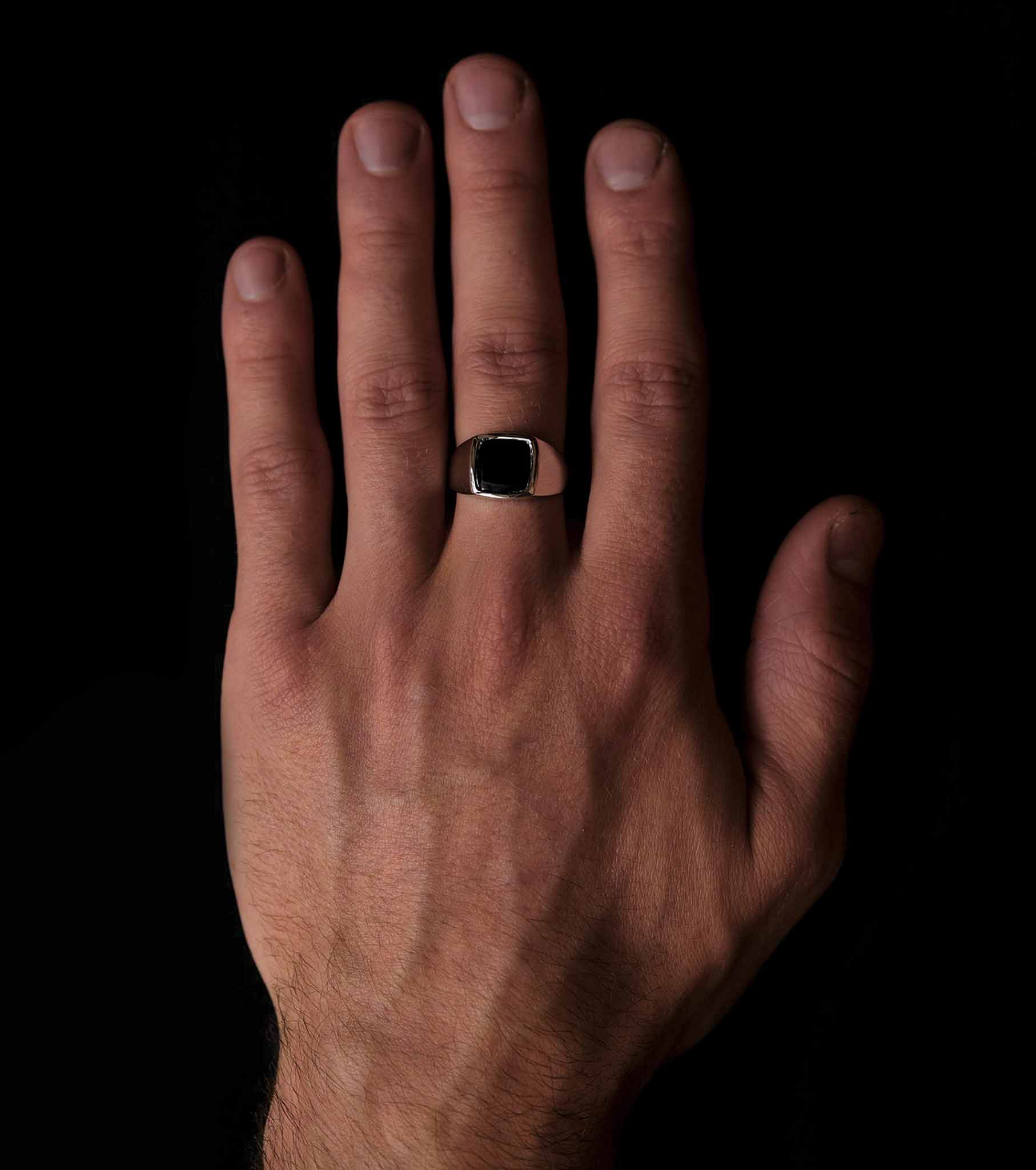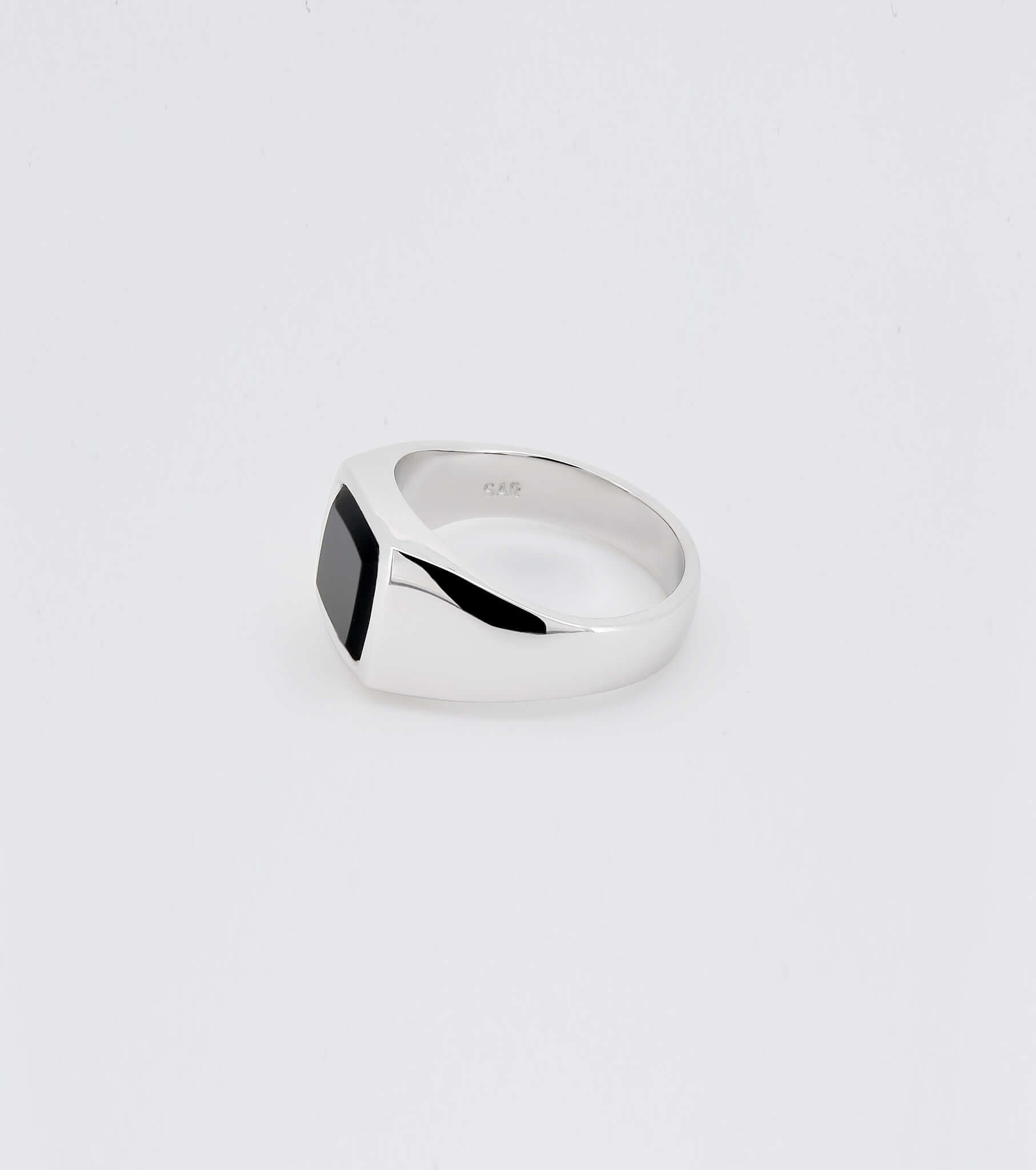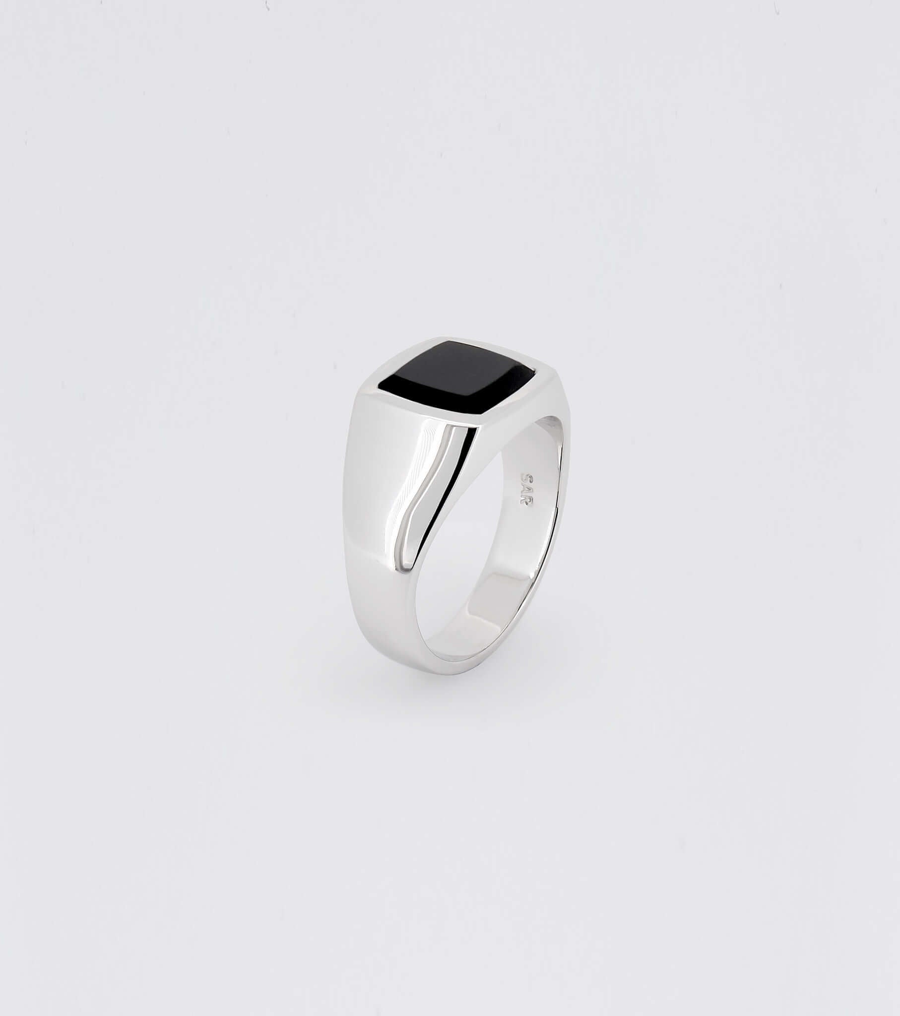 A hand cut black onyx with stepped edges is set in our Bevelled signet