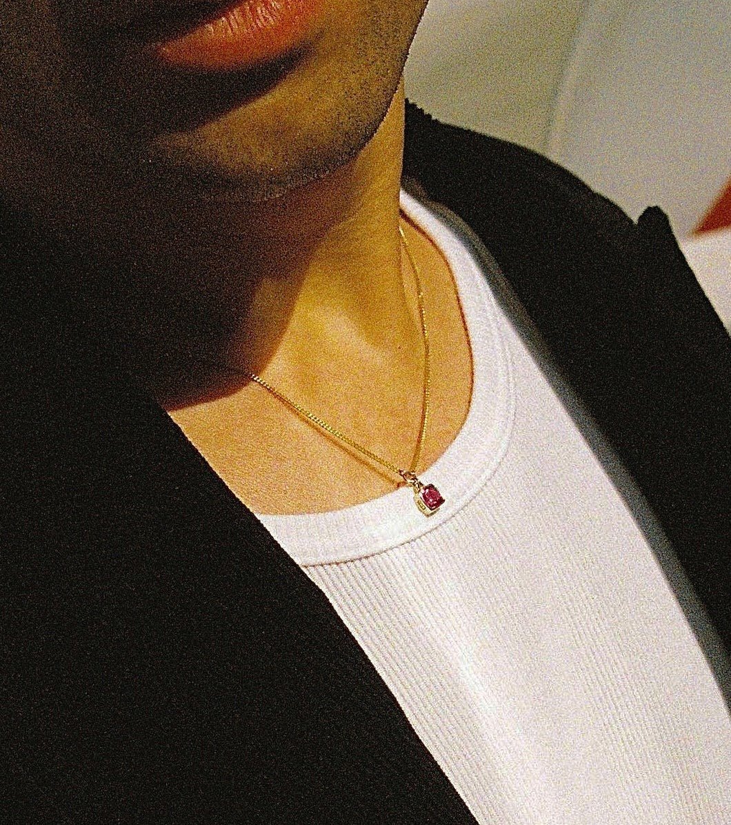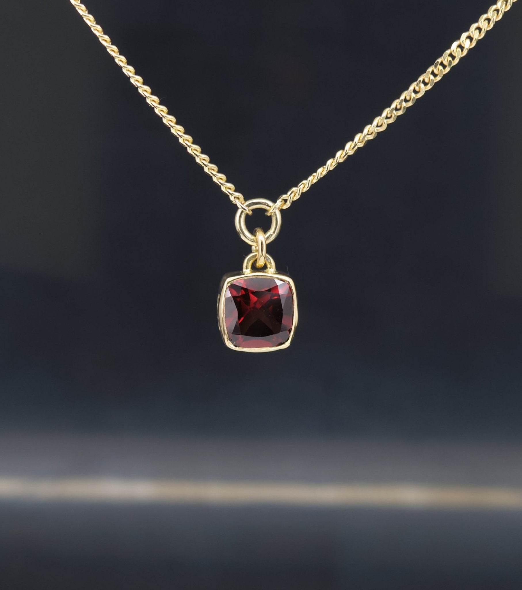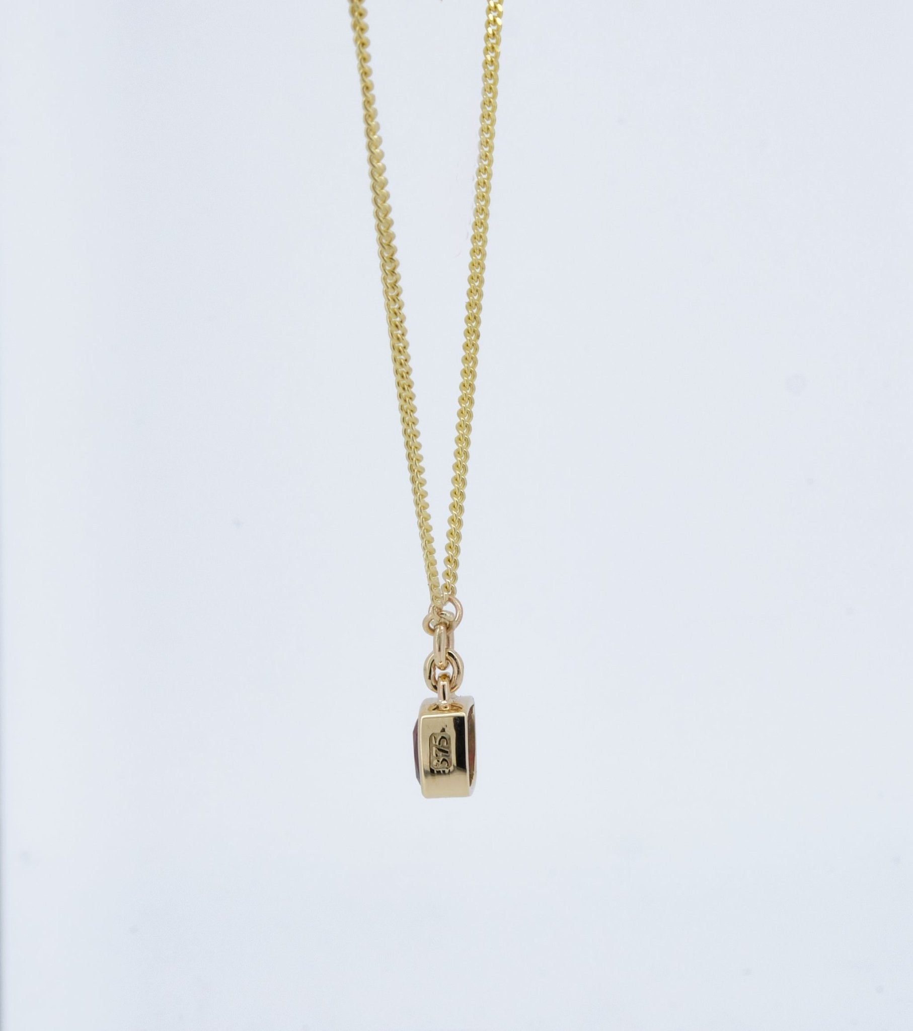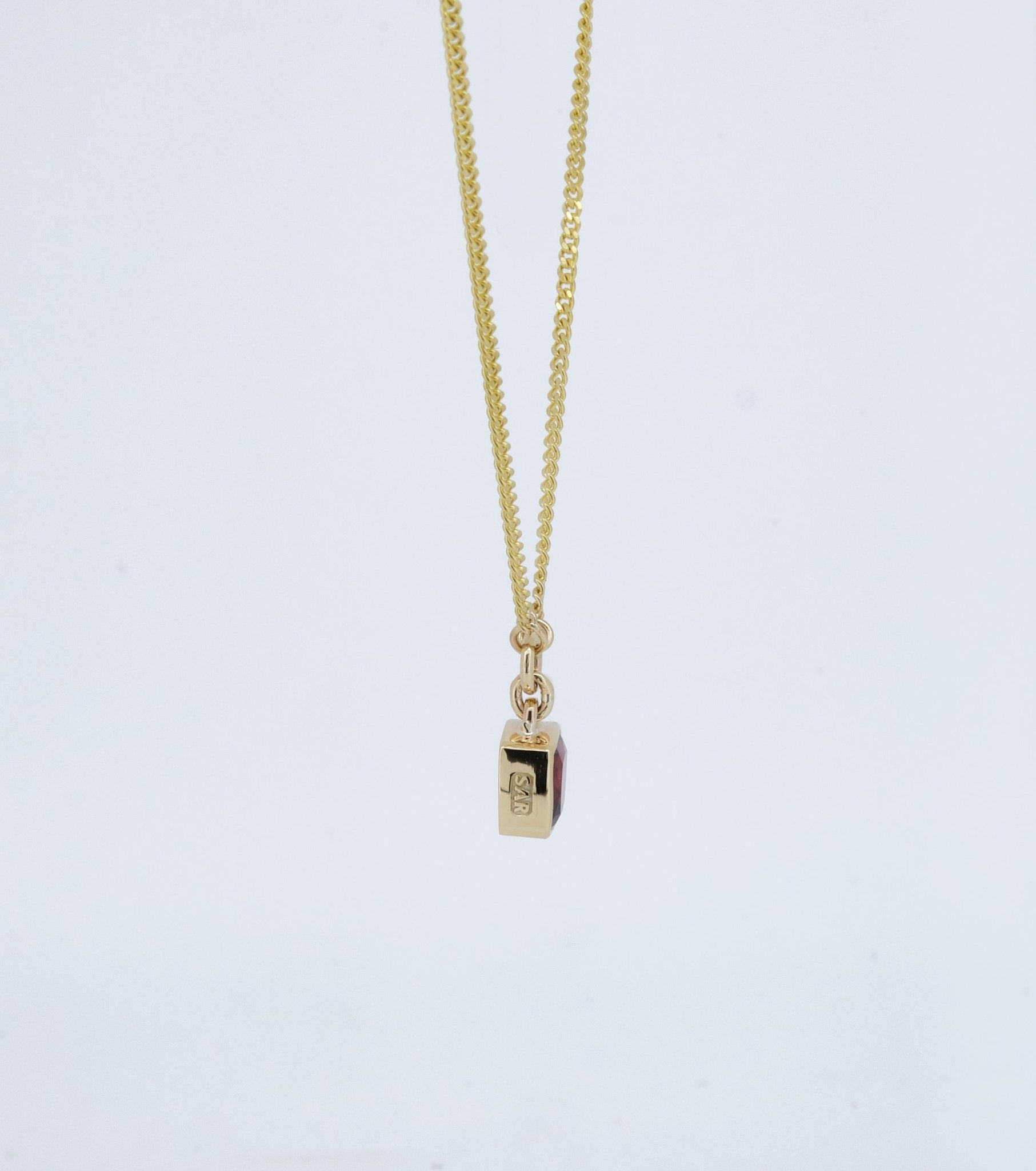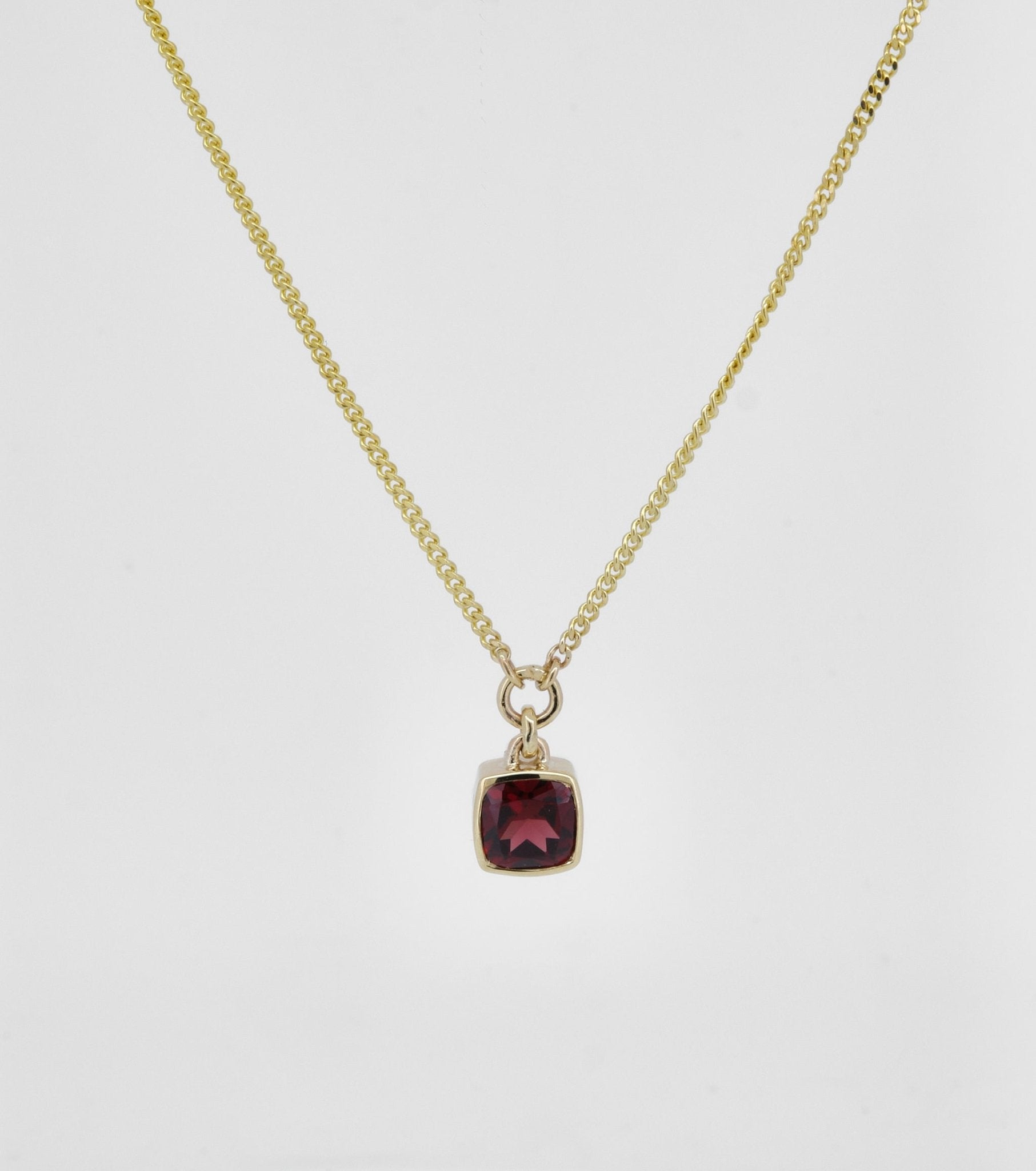 A faceted rich red garnet is set in our Facet pendant, linked by a bold ring to a curb chain, all crafted in 9ct yellow gold. A talisman of protection and passion.