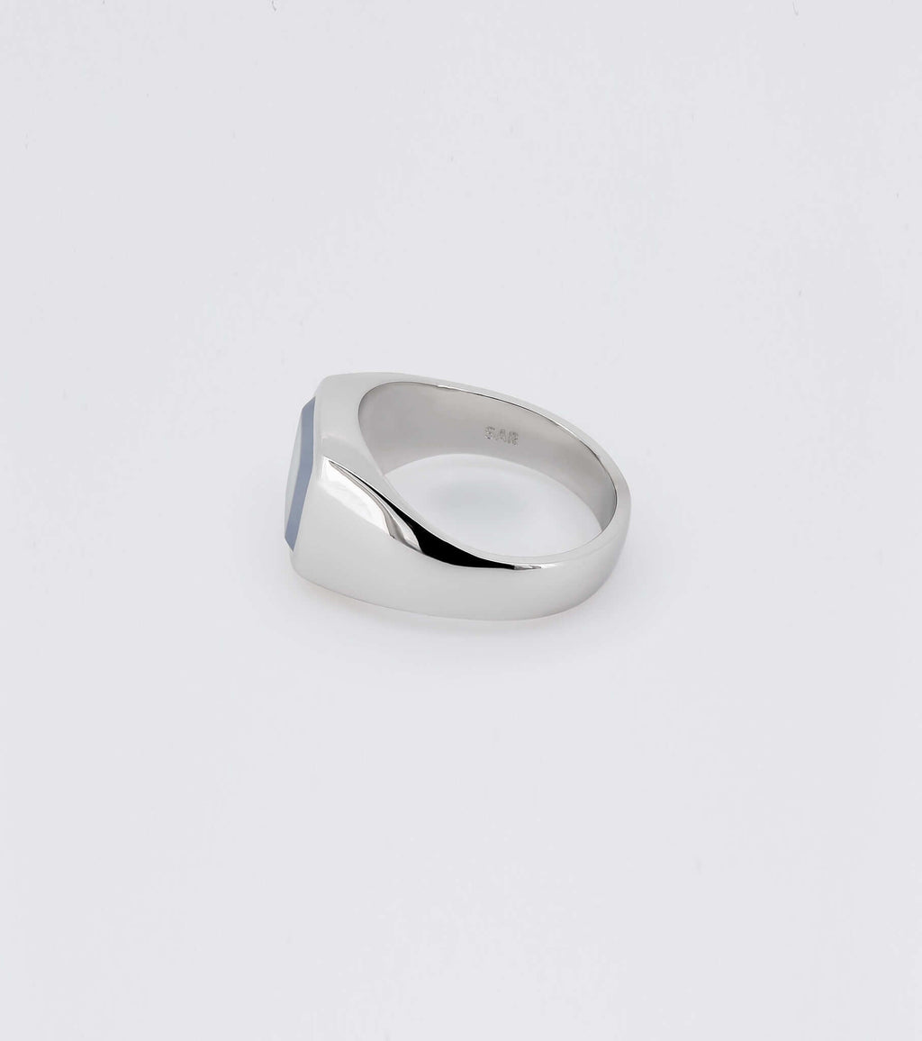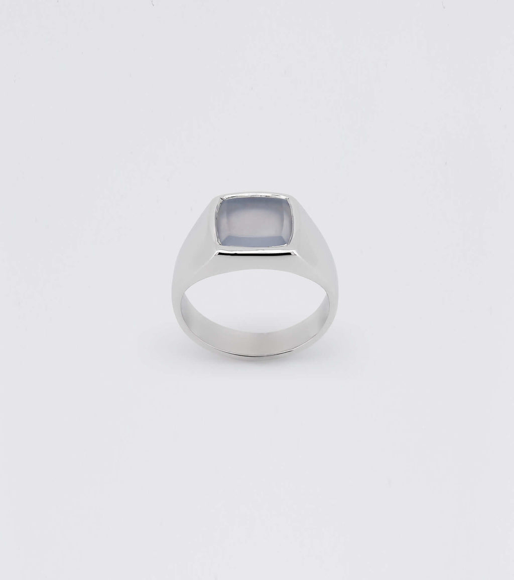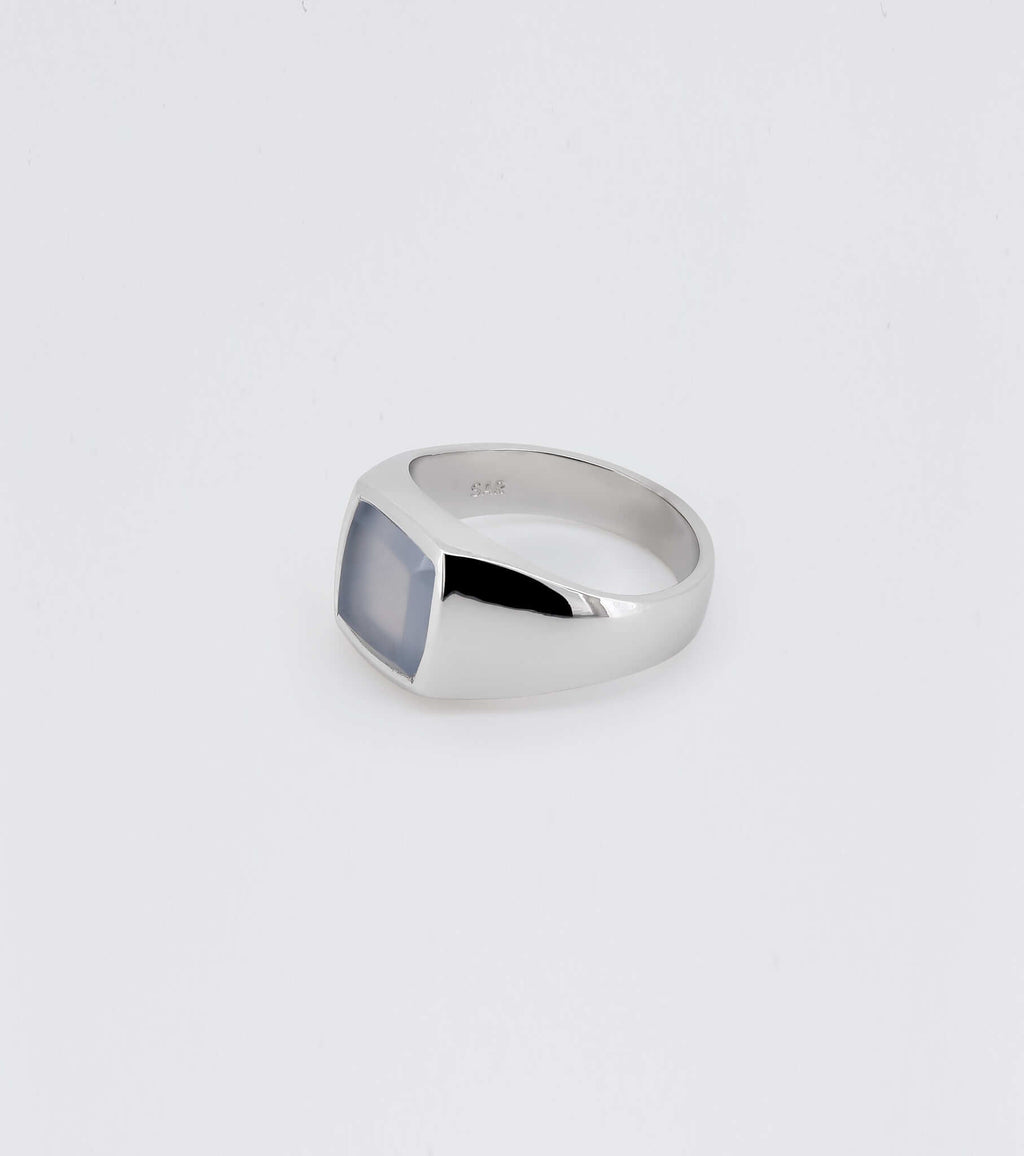 A milky blue chalcedony is set into the face of our sterling silver Bevelled Signet. Its bevelled edges create a layered effect and the stone holds the palest of blue hues.