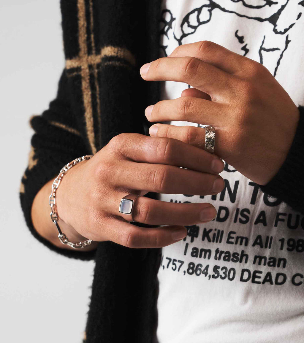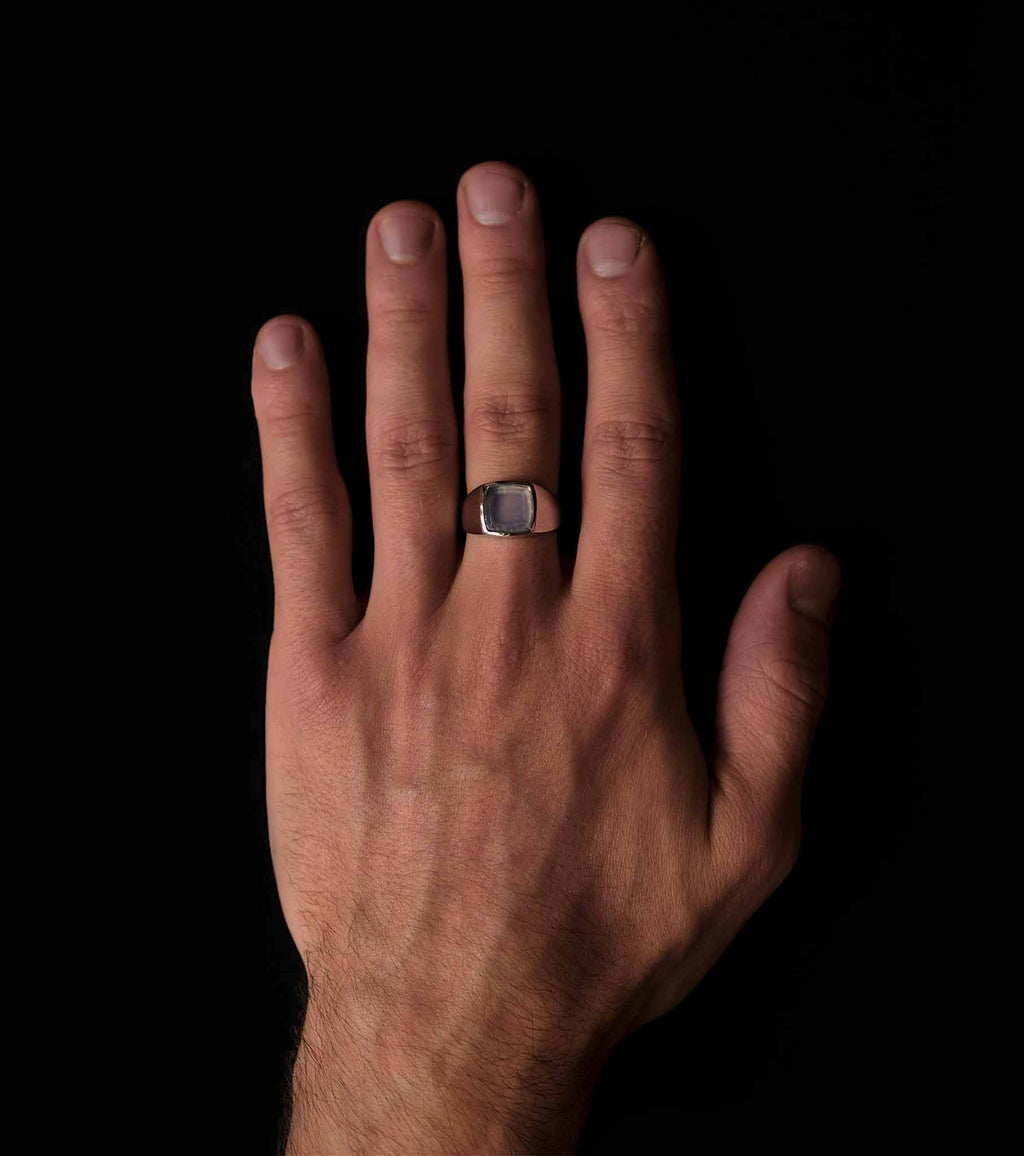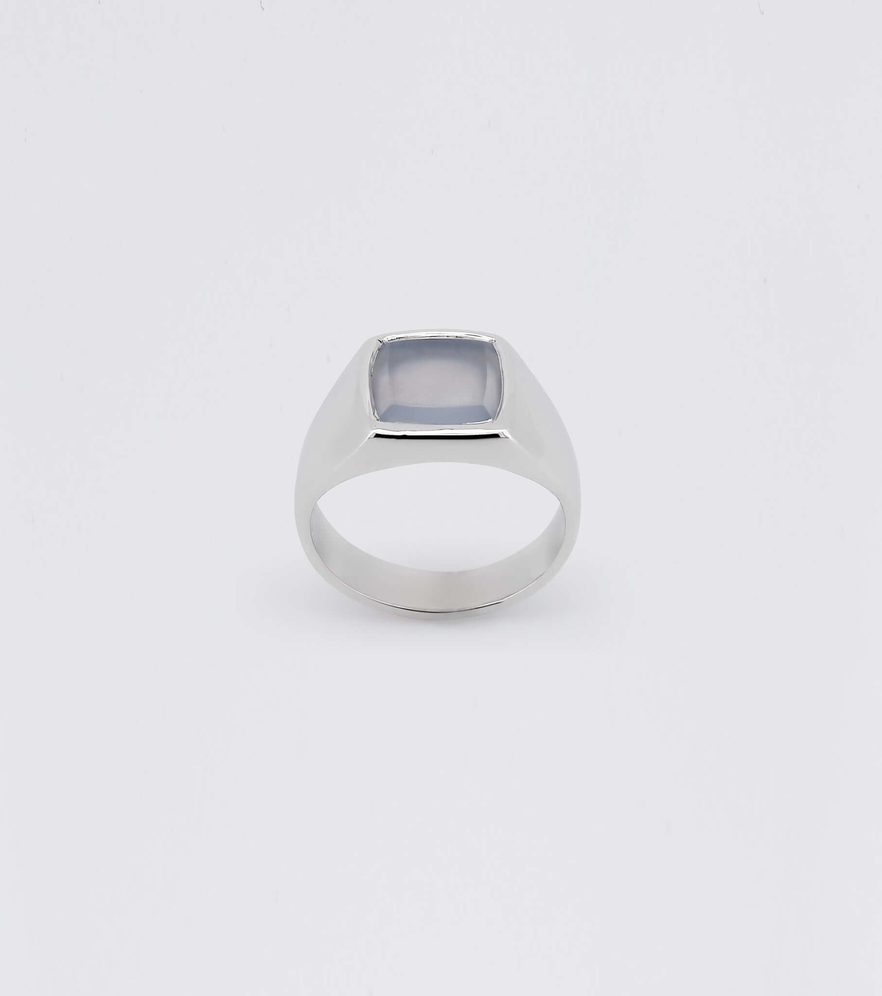 A milky blue chalcedony is set into the face of our sterling silver Bevelled Signet. Its bevelled edges create a layered effect and the stone holds the palest of blue hues.